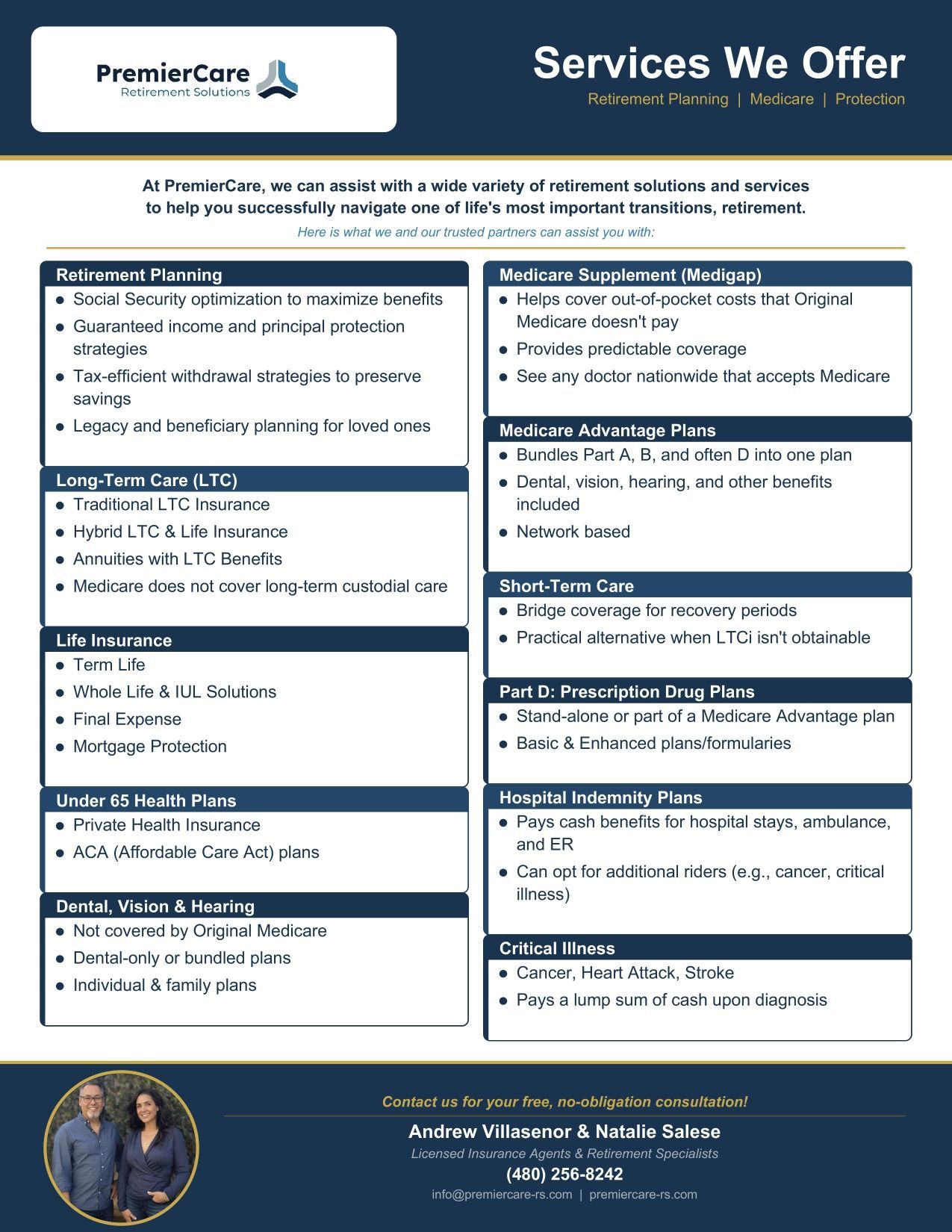 We do not offer every plan available in your area. Any information we provide is limited to those plans we do offer in your area. Please contact Medicare.gov, 1-800-MEDICARE or your local state health insurance program to get more information on all your options. We are licensed insurance agents and do not provide legal, tax, or investment advice. Any discussion of retirement planning is limited to insurance and income strategies and is not intended to provide comprehensive financial planning or investment advice. Please consult with a qualified financial advisor, tax professional, or attorney regarding your specific situation before making financial decisions.